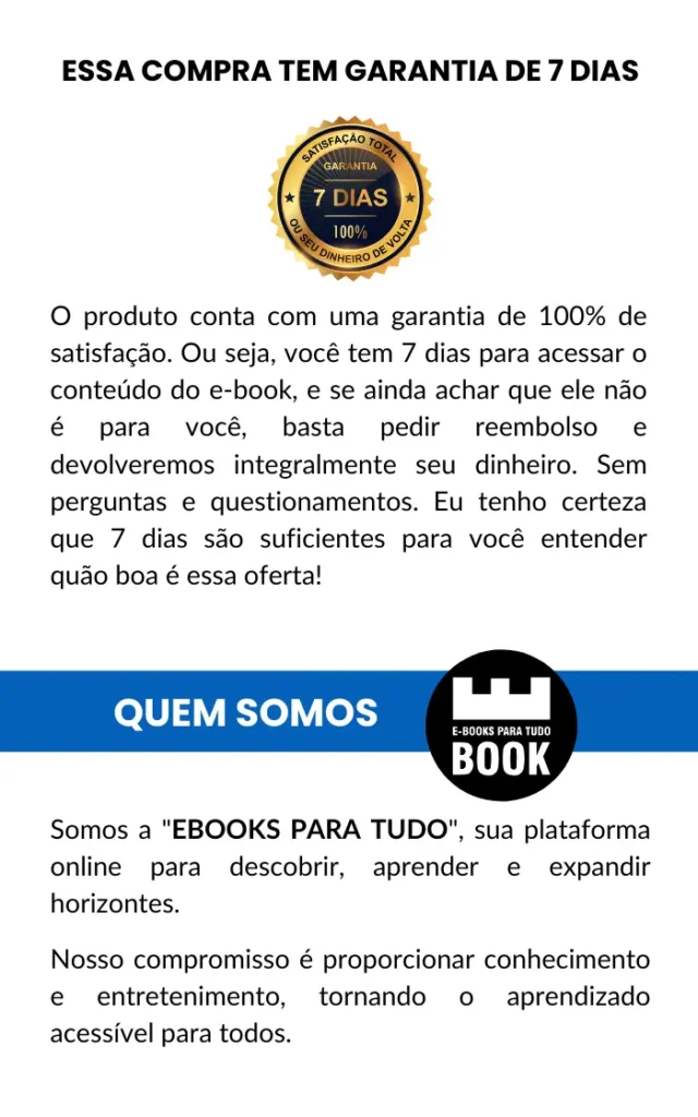 O produto conta com uma garantia de 100% de satisfação. Ou seja, você tem 7 dias para acessar o conteúdo do e-book, e se ainda achar que ele não é para você, basta pedir reembolso e devolveremos integralmente seu dinheiro. Sem perguntas e questionamentos. Eu tenho certeza que 7 dias são suficientes para você entender quão boa é essa oferta!